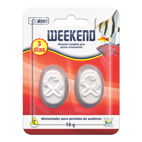 Alcon Weekend garante a alimentação dos peixes em períodos de viagens e ausência, quando não é possível alimentá-los diariamente com os alimentos tradicionais. Este facilitador é um bloco de sulfato de cálcio que serve de suporte para grânulos de alimento de qualidade, que são liberados aos peixes à medida que o bloco vai se dissolvendo na água do aquário.