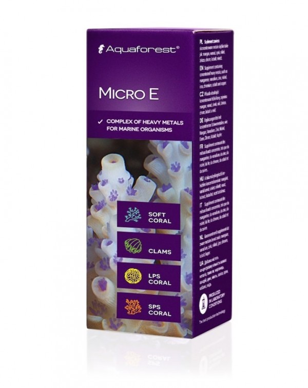 Suplemento contém metais pesados, tais como: o manganês, vanádio, zinco, níquel, ferro, crómio, cobalto, cobre. Os oligoelementos estão presentes em quantidades muito pequenas na água do mar, no entanto, são muito importantes para a criação de corais. Micro E permite a dosagem de metais pesados em proporções adequadas. OS oligoelementos realçam as cores dos corais. Dosagem: 01 gota para cada 100 litros por dia.
