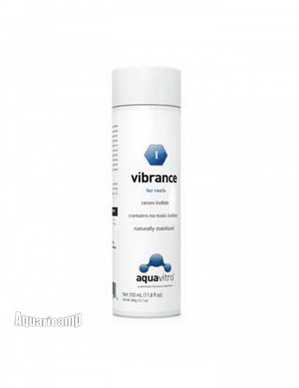 Vibrance - O iodeto é importante para a formação dos tecidos dos invertebrados, desenvolvimento dos pigmentos em corais, anêmonas e algas como zooxantela; - Não contém iodo tóxico; - É concentrado 10000 mg/L, seguro, estável e prontamente disponível. *Contém 350ml.
