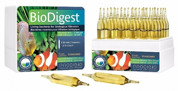 Para instalação ou reposição de bactérias. BIODIGEST é composto de 09 cepas de bactérias (20 bilhões de bactérias vivas por ampola) nitrificantes e denitrificantes selecionadas por sua capacidade de transformar amônia em nitritos, nitritos em nitratos e posteriormente em nitrogênio. As cepas de BIODIGEST são escolhidas pela eficiência delas e a compatibilidade em água doce ou salgada. Cada bactéria começa um processo que é continuado por outra bactéria até que as combinações de nitrogênio tóxicas (amônia e nitrito) são quebradas em nitrato menos tóxico, que posteriormente se transforma em nitrogênio. Uma vez adicionadas ao aquário as bactérias se fixam as rocha e ao substrato e se "alimentam" da sujeira dissolvida na água do aquário, reduzindo amônia, fosfatos, nitritos e nitratos. Previne o surgimento de algas indesejáveis (algas vermelhas ou filamentosas), pois melhora muito a qualidade da água. Comem restos de comida e toda matéria orgânica (sujeira). A apresentação em ampolas fechadas com azoto permite uma melhor e longa conservação do seu conteúdo. BIODIGEST deve ser usado nas seguintes situações: Quando inicia o seu aquário (período de ciclagem); quando surgem elevados níveis de amônia, nitratos; depois da limpeza dos filtros; quando a qualidade da água se deteriora (água escura, odores pouco agradáveis, algas soltas); para reposição de bactérias depois da limpeza do aquário. Para purificação de aquários já estabilizados. BIODIGEST reduz a probabilidade de infecções e doenças nos peixes. BIODIGEST, quando usado de modo regular (a cada 15 dias) estabiliza a quantidade de bactérias existentes e melhora a qualidade da água. BIODIGEST para Aquários novos, no período de ciclagem: 1 ampola para cada 60 litros a cada 15 dias. BIO DIGEST é particularmente eficiente nas 2 semanas que seguem sua aplicação. Purificação de aquários já existentes: 1 ampola até 1.000 litros a cada 15 dias. Como usar: Quebre com um pequeno pedaço de mangueira de aquário uma ponta da ampola, vire este lado quebrado para baixo e quebre a ponta de cima da ampola e o produto cairá no aquário, lave a ampola com água do aquário para completo aproveitamento do produto. Você também pode jogar o conteúdo (bactérias) somente no filtro biológico. Produtos em embalagens plásticas se degradam assim que se abrem as embalagens. A apresentação de BIODIGEST em ampolas é muito econômica porque 100% do produto são aproveitados, isto é todas as bactérias estão vivas. BIODIGEST pode ser usado tanto para água doce ou salgada. Para aquários marinhos: Algumas das bactérias presentes são capazes de realizar a biosíntese de nitrato e fosfato em condições aeróbicas através de enzimas redutoras. Isto permite que a água seja efetivamente purificada, deixando seus corais mais coloridos, os peixes mais saudáveis e ajudando a se livrar de problemas como algas diatomáceas, cianobactérias, valonias e todo tipo de problema advindo do excesso de nutrientes.