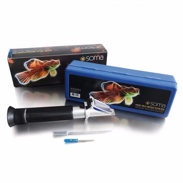 Aparelho projetado para medir e, além disso, testar a concentração de salinidade da água marinha. É recomendado para uso em laboratórios de pesquisa e análise. A escala de leitura do refratômetro SOMA assegura a simultaneidade na leitura da densidade e, ainda mais, da concentração em partes por mil (PPT) de sal dissolvido.