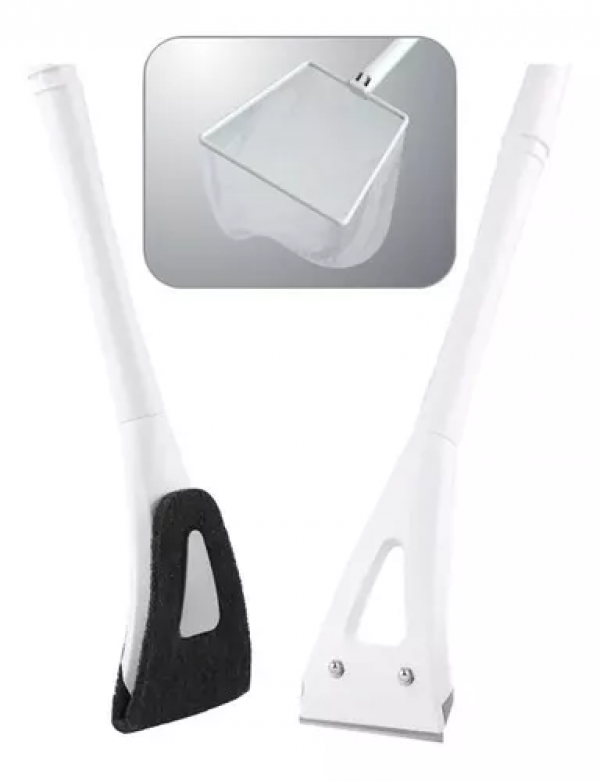 O kit de limpeza para aquário 3 em 1 é ajustado para raspagem de algas, limpeza e captura de peixes.