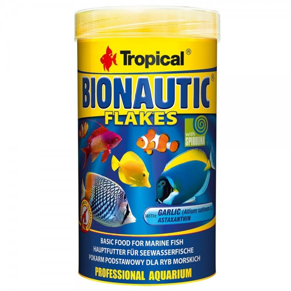 BIONAUTIC FLAKES da TROPICAL é um alimento básico em forma de flocos com múltiplos ingredientes, ideal para o consumo diário de peixes onívoros, espécies pequenas e médias dos peixes marítimos e crustáceos.