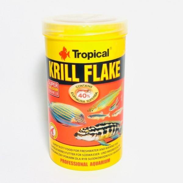 Krill Flake é um alimento a base krill (Euphausiacea) rico em nutrientes, para peixes ornamentais carnívoros e onívoros com elevadas necessidades nutricionais e exigentes em relação às rações industrializadas. Com múltiplos ingredientes, com alto teor de krill antártico (40%), com proteínas biológicas valiosas, ácidos graxos insaturados, ácidos gordos insaturados (incluindo Omega 3), aminoácidos e corantes naturais.